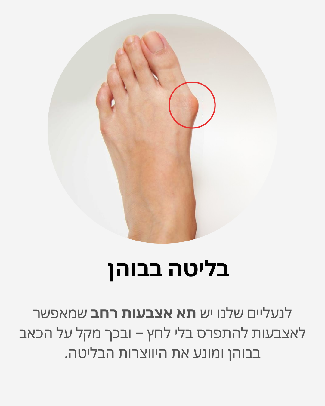 ✓ קופסה רחבה לאצבעות – מעניקה מרחב תנועה טבעי לאצבעות, מה שתורם לחיזוק וגמישות כף הרגל.